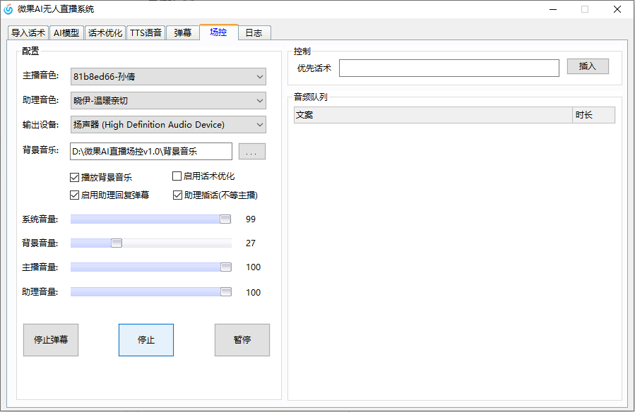 暂停按钮,暂停后只暂停当前播放任务和语音生成任务。暂停取消后继续按照之前内容继续工作。